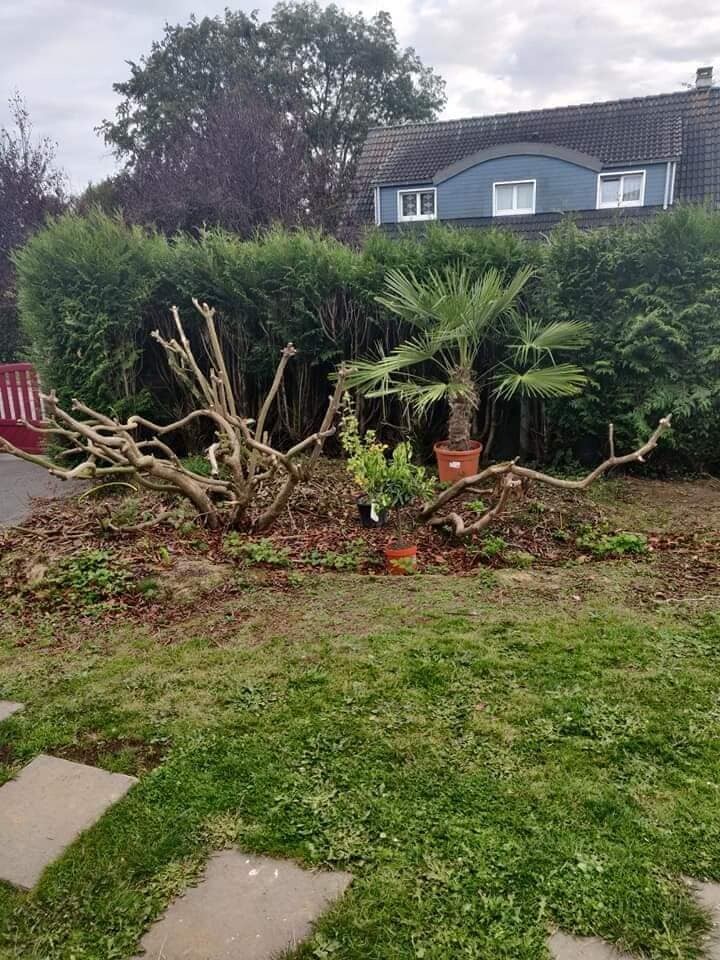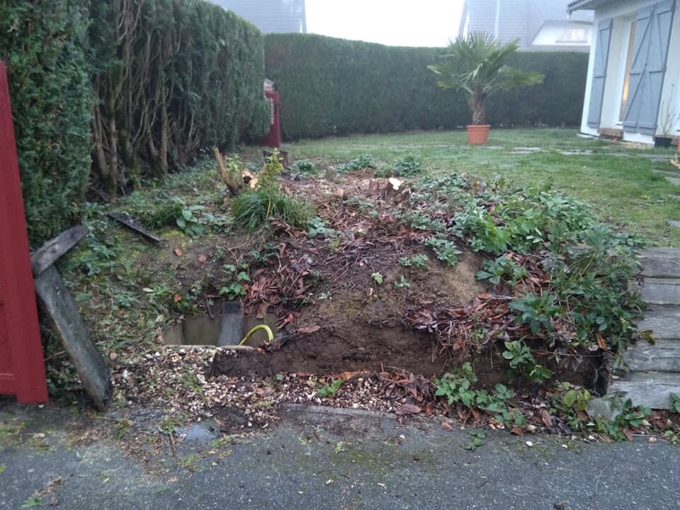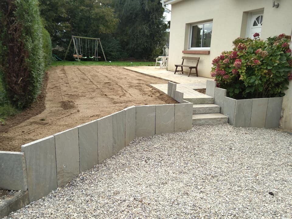 Pour cela, nous avons réalisé un muret en traverses paysagères, qui est en bois de chêne, ce qui permet de délimiter, et d’avoir un rendu net et précis. Cela permet aussi de mettre le petit escalier en valeur, et lui attribuer son espace, sans verdure qui empiète sur les marches.