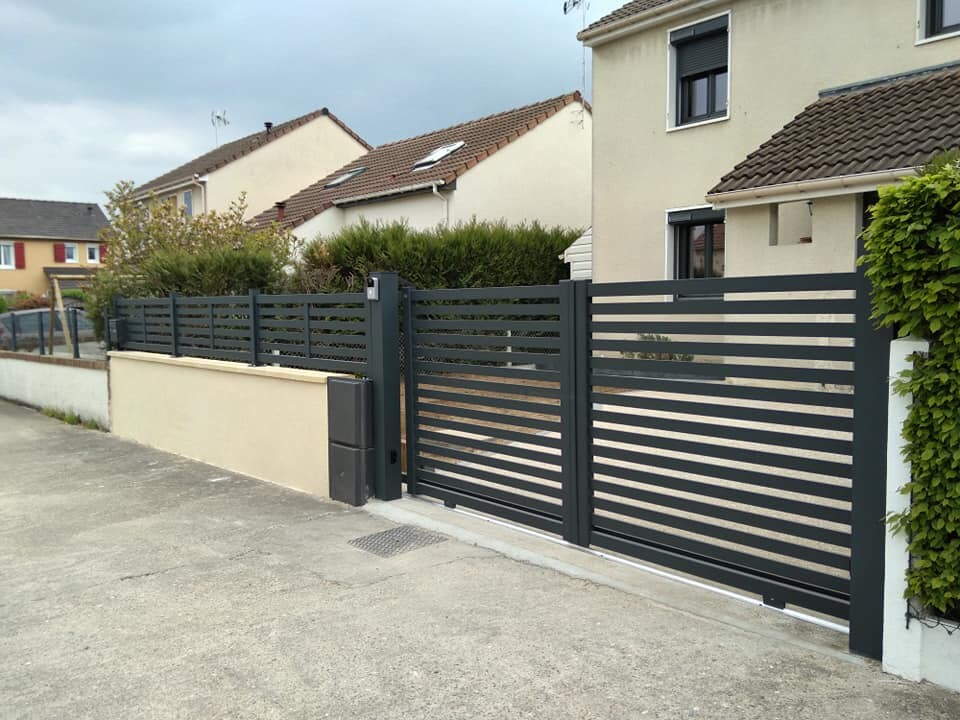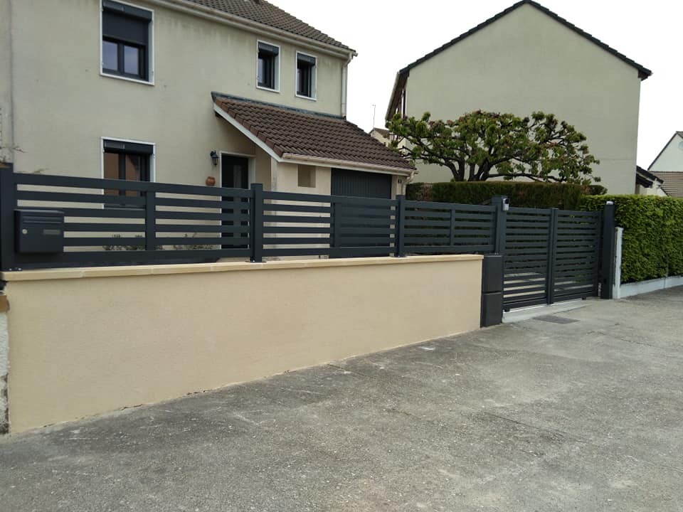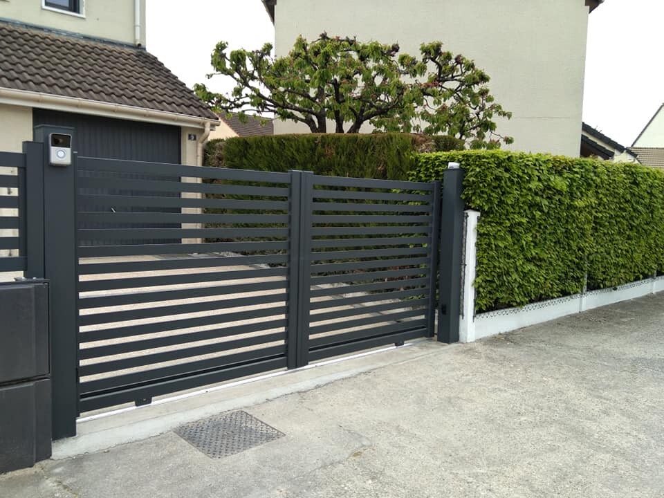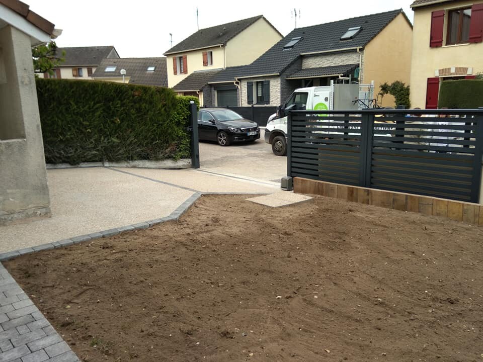 Le long du portail intérieur, nous avons réalisé avec des traverses paysagères, un brise vue pour le rail. Cela donne un côté naturel toujours avec modernité.