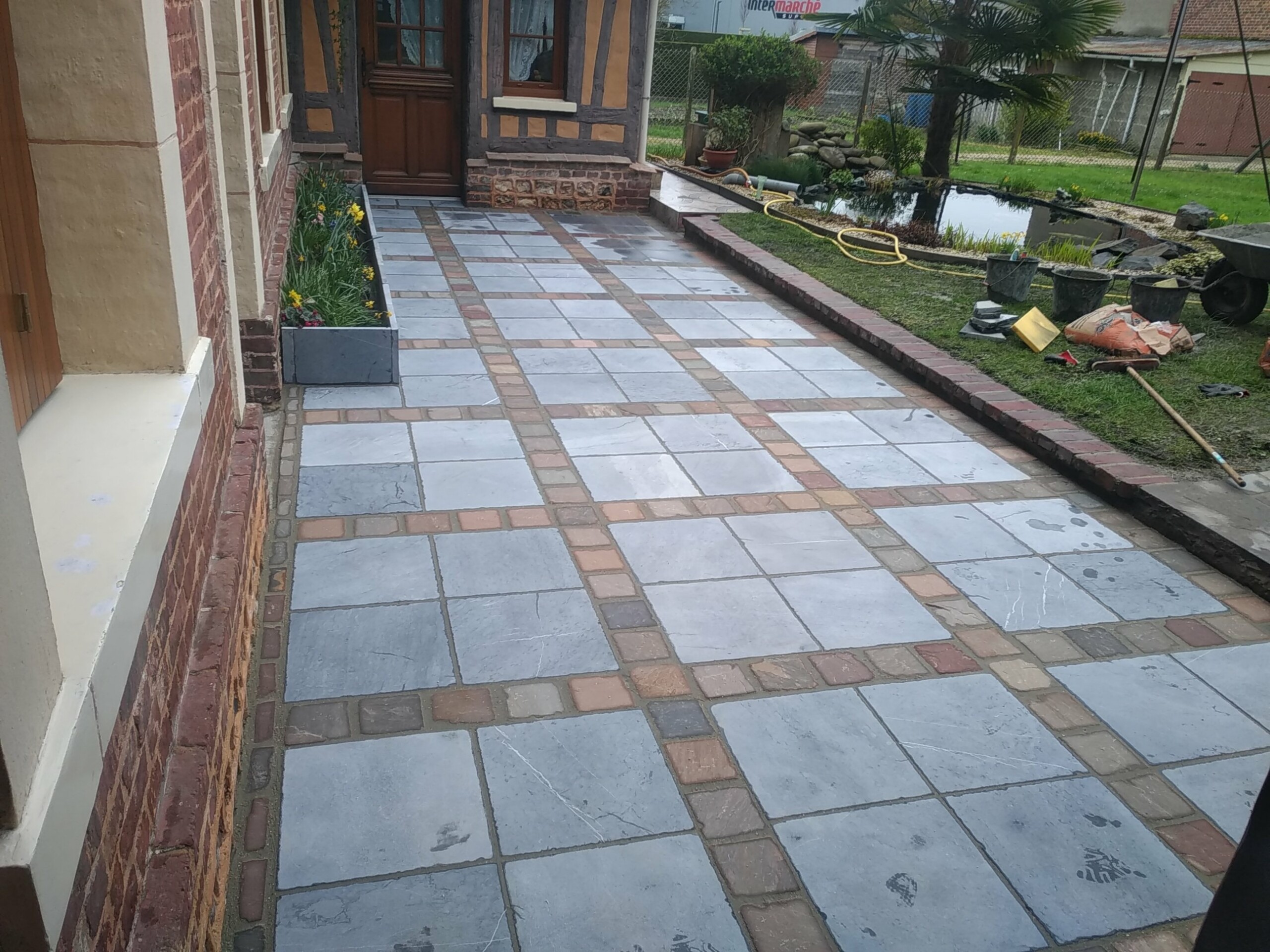 Nous avons aussi réalisé le long de l’allée en pavé, une jardinière en ardoise, pour un coté moderne, en adéquation avec le reste du chantier.