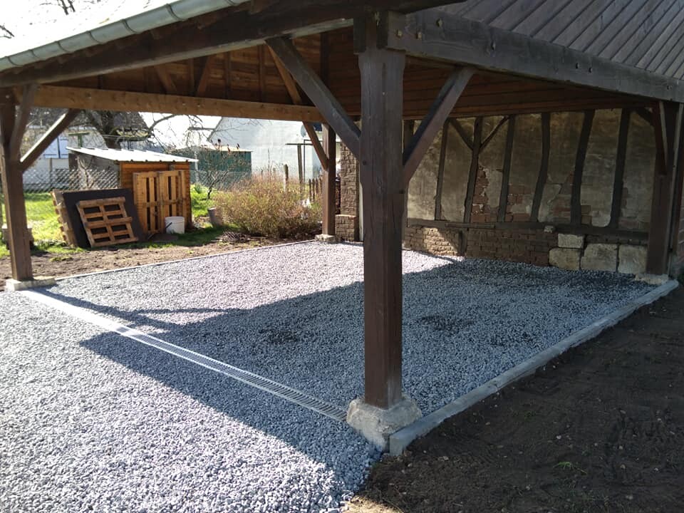 Nous avons fini avec la pose d’un géotextile, afin de placer le tout-venant et la gravelle, pour pouvoir avoir un rendu net.