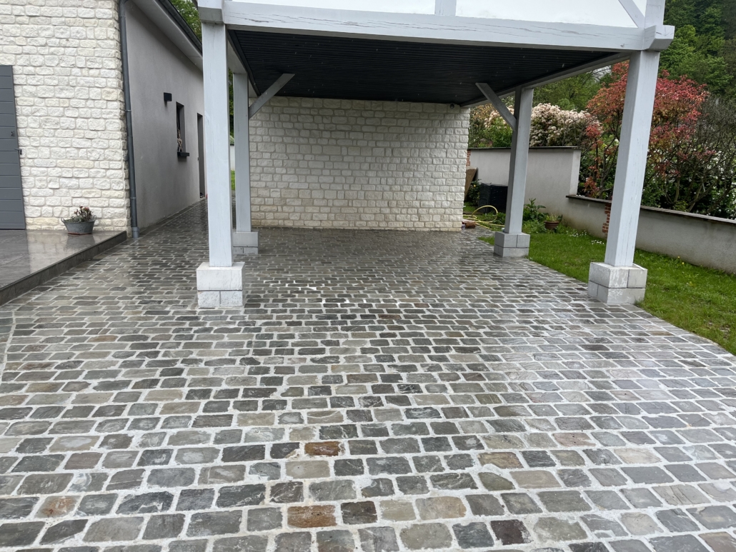 Nous avons réalisé pour un de nos client situé à Caumont dans l’Eure (27) une rénovation de son parking en pavé. Afin de rendre son extérieur plus harmonieux, nous avons choisi des pavés en grès kandla. La surface que nous devions recouvrir était particulièrement importante : 200m².